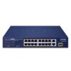 • specifications_tab: <table style="width:100%;" class="common_table_sky"><thead><tr><th colspan="2">Hardware Specifications</th></tr></thead><tbody><tr><td class="align-middle">Fast Ethernet Copper Ports</td><td>16 x 10/100BASE-TX RJ45 auto-MDI/MDI-X ports</td></tr><tr><td class="align-middle">Gigabit Ethernet Copper Ports</td><td>2 x 10/100/1000BASE-T RJ45 auto-MDI/MDI-X ports <br /> (Port-17 shared with SFP port)</td></tr><tr><td class="align-middle">SFP Ports</td><td>1 x 1000BASE-SX/LX/BX SFP interface (shared with Port-17)</td></tr><tr><td class="align-middle">DIP Switch</td><td>Selectable operation mode<br /> - Standard<br /> - VLAN<br /> - Extend</td></tr><tr><td class="align-middle">Dimensions (W x D x H)</td><td>280 x 180 x 44 mm (1U height)</td></tr><tr><td class="align-middle">Enclosure</td><td>Metal</td></tr><tr><td class="align-middle">Weight</td><td>1800g</td></tr><tr><td class="align-middle">Power Requirements</td><td>100~240V AC, 50/60Hz, 5A max.</td></tr><tr><td class="align-middle">Power Consumption/Dissipation</td><td>Max. 207 watts/706 BTU</td></tr><tr><td class="align-middle">Thermal Fan</td><td>1</td></tr><tr><td class="align-middle">ESD Protection</td><td>Contact discharge of ±6KV DC,<br /> Air discharge of ±8KV DC</td></tr><tr><td class="align-middle">Surge Protection</td><td>Differential Mode ±4KV, Common Mode ±6KV</td></tr><tr><td class="align-middle">Installation</td><td>Desktop or rack-mount installation</td></tr><tr><td class="align-middle">LED Indicators</td><td><b>System </b><br /> Power (Green)<br /> PoE Max. (Green)<br /> <b>10/100/1000T RJ45 Interfaces </b><br /> 10/100/1000 LNK / ACT (Green)<br /> PoE-in-Use (Amber)<br /> <b>1000X SFP Interfaces </b><br /> 1000 LNK / ACT (Green)</td></tr></tbody><thead><tr><th colspan="2">Switching</th></tr></thead><tbody><tr><td class="align-middle">Switch Architecture</td><td>Store-and-Forward</td></tr><tr><td class="align-middle">Switch Fabric</td><td>7.2Gbps/non-blocking</td></tr><tr><td class="align-middle">Switch Throughput@64bytes</td><td>5.36Mpps</td></tr><tr><td class="align-middle">MAC Address Table</td><td>16K entries</td></tr><tr><td class="align-middle">Jumbo Frame</td><td>16K bytes</td></tr><tr><td class="align-middle">Flow Control</td><td>IEEE 802.3x pause frame for full duplex; back pressure for half duplex</td></tr></tbody><thead><tr><th colspan="2">Power over Ethernet</th></tr></thead><tbody><tr><td class="align-middle">PoE Standard</td><td>IEEE 802.3at Power over Ethernet Plus/PSE</td></tr><tr><td class="align-middle">PoE Injector Ports</td><td>16</td></tr><tr><td class="align-middle">PoE Power Supply Type</td><td>End-span: 1/2 (+), 3/6 (-)</td></tr><tr><td class="align-middle">PoE Power Output</td><td>Per port 55V DC, 600mA. max. 32 watts</td></tr><tr><td class="align-middle">PoE Power Budget</td><td>185 watts</td></tr><tr><td class="align-middle">Number of PDs, 7 watts</td><td>16</td></tr><tr><td class="align-middle">Number of PDs, 15.4 watts</td><td>12</td></tr><tr><td class="align-middle">Number of PDs, 30 watts</td><td>6</td></tr></tbody><thead><tr><th colspan="2">Standards Conformance</th></tr></thead><tbody><tr><td class="align-middle">Regulatory Compliance</td><td>FCC Part 15 Class A, CE</td></tr><tr><td class="align-middle">Standards Compliance</td><td>IEEE 802.3 10BASE-T<br /> IEEE 802.3u 100BASE-TX<br /> IEEE 802.3ab Gigabit 1000BASE-T<br /> IEEE 802.3z Gigabit SX/LX<br /> IEEE 802.3x flow control and back pressure<br /> IEEE 802.3af Power over Ethernet<br /> IEEE 802.3at Power over Ethernet Plus<br /> IEEE 802.3az Energy-Efficient Ethernet</td></tr></tbody><thead><tr><th colspan="2">Environment</th></tr></thead><tbody><tr><td class="align-middle">Operating</td><td>Temperature: 0 ~ 50 degrees C<br /> Relative Humidity: 5~ 95% (non-condensing)</td></tr><tr><td class="align-middle">Storage</td><td>Temperature: -10 ~ 70 degrees C<br /> Relative Humidity: 5 ~ 95% (non-condensing)</td></tr></tbody></table>